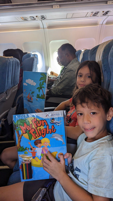 וגם צוות דיילי האוויר הביאו להם חוברות צביעה ועפרונות כדי להעביר את הזמן. ליה עפה על זה, הגדולים קצת פחות…