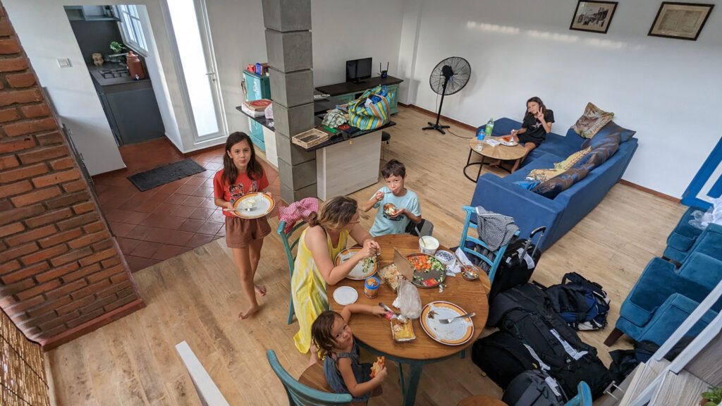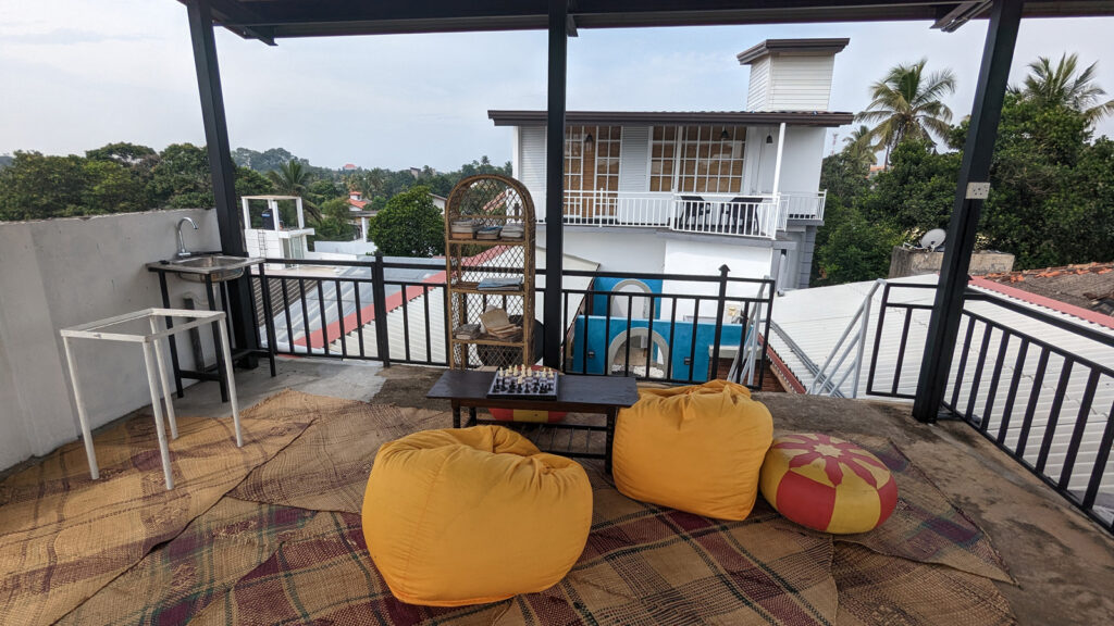 איזה תענוג המקום הזה שאנו ישנים בו, להוציא את עניין היתושים המרגיזים שזה באמת מכה כאן, ועניין הפסקות החשמל היזומות (בשל המצב הכלכלי כאן במדינה), ממש מקסים פה בדירה השכורה שלנו. מקום גדול, מרווח, ולא מדובר כאן רק בדירה לעצמינו, אלא במתחם שהדירה שלנו היא חלק ממנו, כל המתחם הזה שייך לנו, יש פה בריכת דגים נחמדה ועמדת זולה אליה מטפסים הכי גבוה, הנופים משם הם נופי העיר, יש כאן ספרים, לוח שחמט, פופים מפוזרים על הריצפה. תענוג. בתמונה הבאה – המבנה שאנו רואים ממול (עם המרפסת והחלונות הסגורים) זהו חדר השינה שלנו