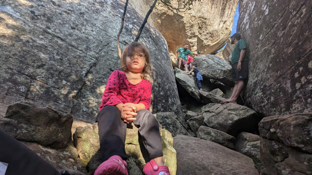 לאחר שעוברים את בודהא השוכב, הדרך מתחילה להיות קשה יותר למעבר, כאן אין מדרגות נוחות לעלות בהן, כעת אנחנו צריכים לקפץ בין בולדרים גדולים, לא פשוט למישהו שסוחב את ליה על מנשא הגב, גם עידו לעיתים התקשה לעבור, למזלינו מצאנו חבורה של מטיילים מקומיים שגם עלו למעלה, הם היו קצת לפנינו, קיבלנו מהם עזרה עם הילדים
