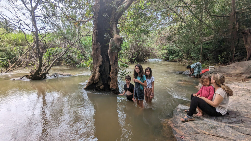 ביקשנו מהנהג לעצור במסעדה הצמודה להום סטיי שלנו, היא נקראת S.L Cafe, שוחחנו מעט עם בעל המסעדה החביב, הוא הסביר לנו על הסלע השלישי (או יותר נכון חצי סלע) הנקרא: Secret Rock והוא אינו מופיע בגוגל מפות, אמר לנו כי הבן הקטן שלו ישמח לקחת אותנו אל המקום בסביבות השעה 17:00, וואלה, מגניב. רשמנו לעצמינו והזמנו מיצים טבעיים לכולנו, מנגו, אננס, אבטיח. חזרנו לחדרים שלנו, השעה הייתה 9:30 בבוקר, דניאל ויובל קמו לא מזמן משנת היופי שלהן. הן היו בדיוק אחרי ארוחת בוקר. נתתי את שק הכביסה שלנו לבעלת ההום סטיי, מאז יומינו השני כאן בסרי-לנקה לא עשינו כביסה והצטבר לנו הר של ממש (אולי הגבעה הרביעית כאן בסיגיריה). אנחנו יצאנו פעם נוספת החוצה, בדרכינו להגיע לאגם ששמענו כי ניתן לשחות בו, הפעם עידו ויובל נשארו בבית, יצאנו לכביש הראשי כאשר מקומי שאל אם אנחנו בדרכינו לנחל, אמנם נחל זה לא אגם, אבל למה שנגיד "לא" ? הוא כיוון אותנו למקום וכעבור 6-7 דקות של הליכה גם הגענו אל הנחל החביב, המקום נמצא בצמידות לגסט האוס, הגענו לשם כדי לראות את הבגדים שלנו מפוזרים על סלע, רטובים ומוקצפים בסבון, אז כן, האמא של בעלת ההום סטיי שלנו עמלה קשה על בגדינו שיהיו נקיים ואנו זכינו לראות את התהליך. נכנסנו למים, לא היה מאוד קר, אבל הזרימה הייתה מעט חזקה, מה הקטע שם במים ? שם ישנם "דגים שמנשקים את הרגליים" או אוכלים את העור היבש. כשהבנו את זה, אני מיד חזרתי לחדר שלנו בהום סטיי, הוצאתי את יובל ועידו מהמיטות והבאתי אותם עד הלום כדי שגם הם יחוו את המקום והדגים.