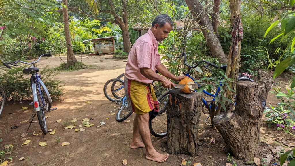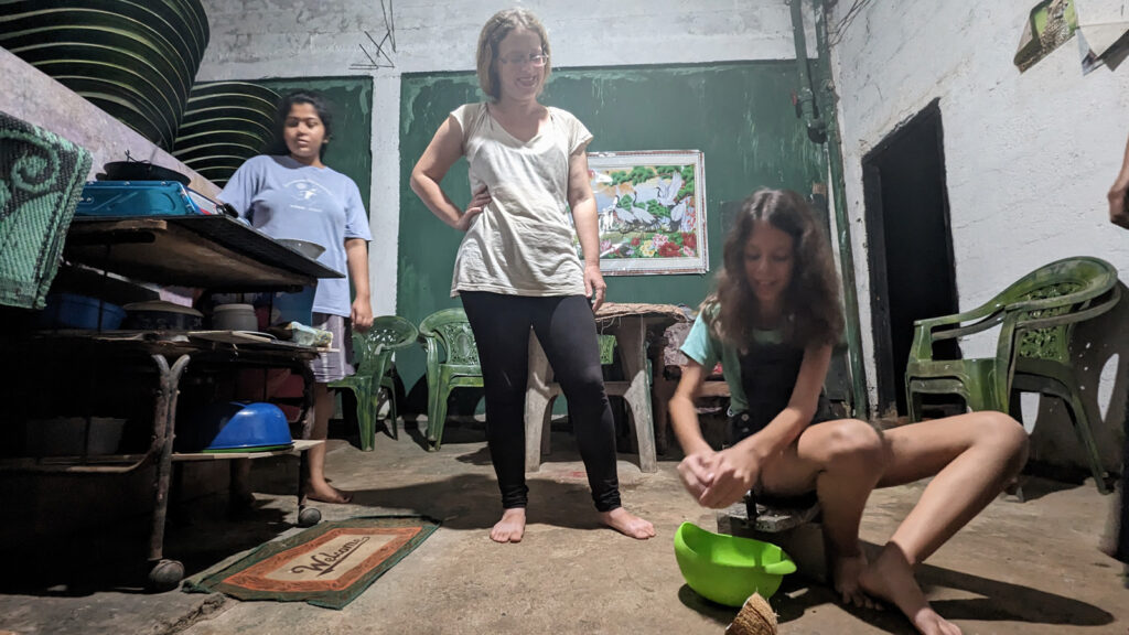בדרך חזרה, עצרנו במיני מרקטים, קנינו שטויות לילדים וקורנפלקס, לילד החמוד שהביא אותנו עד הלום, נתנו שטר של 500 רופי והוא ביזבז אותו במינימרקט על שטויות, "הרוויח את לחמו", מה שנקרא. כאן בהום סטיי שלנו, חלקנו הלכו להתקלח בזמן שאפרת ושאר הילדים עשו סדנת בישול עם בעלת ההום סטיי, זה מדהים כמה ערך אנחנו מקבלים כאן במקום, לא הרבה היו הפעמים שקיבלנו יחס כל כך טוב מצד המארחים (זה היה בהאמפי ובמונרו עד עכשיו), כאן בתמונה דניאל מגרדת קוקוס שאת שבביו אח"כ יכניסו לתבשילי הקארי
