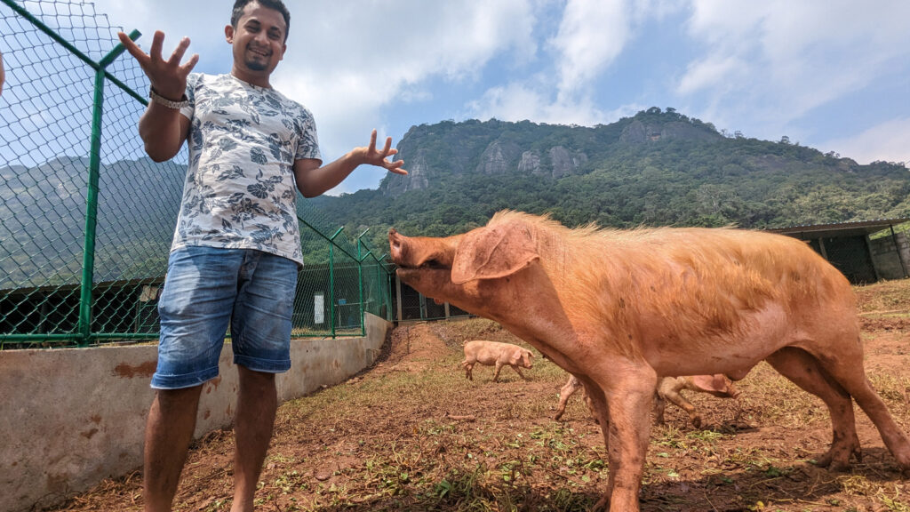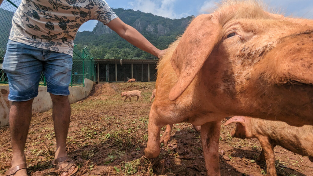 לידנו ישנו כלוב ענק בו חיים כמה עשרות כלבים שנעזבו או חלו בשלב מסויים בחייהם, ובצמוד אליו כלוב של חזירים אשר בעליהם רצה להרוג ולמכור את הבשר, נכנסנו למתחם של החזירים, מעולם לא התקרבנו כל כך לחיה הזו, היא נראית מפחידה אך לא מזיקה