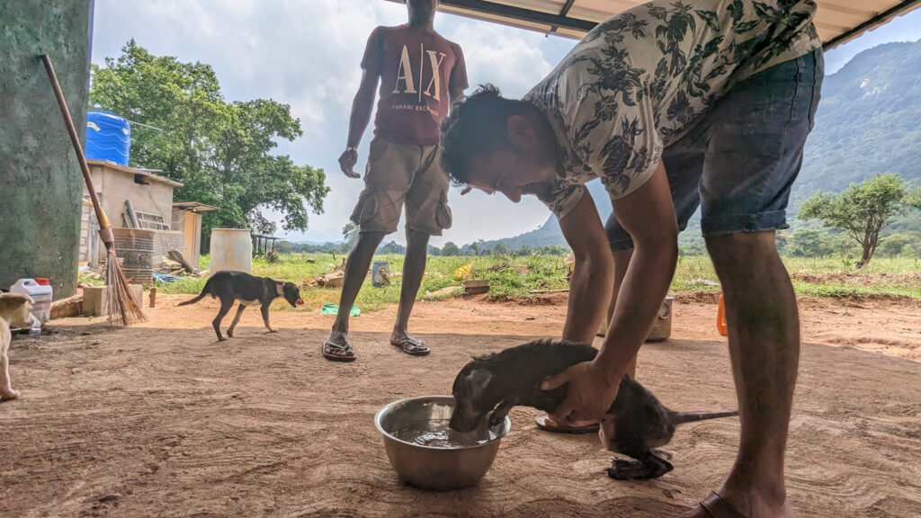 בשעה 11:30 יצאנו מהבית, הפעם נסענו עם בעלה של הבת של זאת שאחראית כאן עם ההום סטיי שלנו, הבעל, פתח לפני כשנתיים עם אשתו בית מחסה לכלבים חסרי דיור, כאלו שנפצעו, שנדרסו, שנולדו עם מומים שונים, הוא פתח עמותה ומקיים את הביזנס שלהם רק מתרומות של אנשים, זה לא פשוט כי כאן בסרי לנקה, זה לא כל כך נהוג לתרום לעמותות כאלו של בעלי חיים. נסענו איתו בטוקטוק כחצי שעה בערך מהבית, אל המקום שאפילו אינו מופיע בגוגל מפות, הוא נמצא כאן. עצרנו בצד הדרך עם הטוקטוק והלכנו למתחם הכלבים ברגל (עוד כ-5 דקות הליכה), המקום נקרא Leon's Sanctuary על שם הכלב שלו שהורעל ע"י השכנים