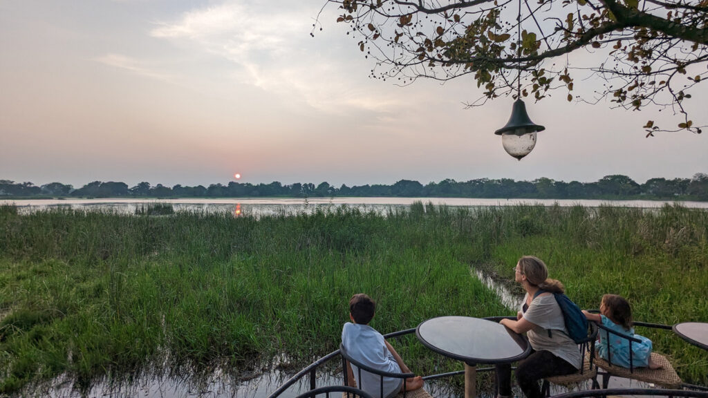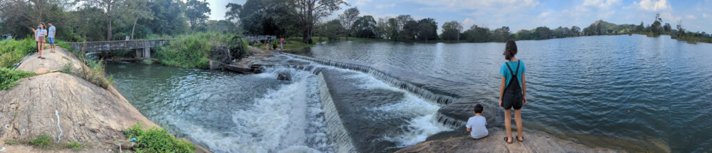 חזרנו להום סטיי, ולקראת שקיעה החלטנו ללכת לסיבוב אחרון להיום בחוץ, השעה הייתה כבר 17:00 כשיצאנו אני, אפרת, עידו וליה לכיוון האגם, הליכה של כ-20 דקות בסה"כ עד שמגיעים אל מקדש נחמד על גבעה קטנה, ישנה בריכה קטנה במקום ועוד כמה מקדשים ונזירים שמתפללים ומתחזקים שם את העסק, מבוגרת עם נכדה עלו איתנו במדרגות אל המקדש, מסתבר שהיא האמא של בעל המסעדה ממול להום סטיי שלנו, מסעדת 68, בה שתינו מיצים אתמול, כן, כולם פה בכפר איכשהו קרובי משפחה אחד של השני, חמולות במילים אחרות (אבל במובן החיובי, ללא הקונוטציות השליליות), לאחר סיבוב קצר במתחם המקדש, ירדנו בחזרה מהסלע עליו בנוי המקדש והמשכנו ללכת לכיוון האגם, כעבור כמה דקות הליכה הגענו אליו, אגם Lenawa Maha Wawa התגלה בפנינו בזמן שהשמש כבר נשקה אל קו האופק והמראה עם האגם מקדימה לא יכל להוות תפאורה טובה יותר ממה שקיבלנו, אנחנו המשכנו ללכת עד שהגענו לריזורט מושקע ויוקרתי, הוא היה ריק מאדם, מלבד כמה תיירים מקומיים ששתו להם משקאות במסעדה על שפת האגם עם תצפית מצויינת, זהו מסוג הריזורטים שאיננו רגילים לראות במסע הזה, אולי בהמשך, לא כרגע. עלות של לילה אחד כאן שווה ערך לשבוע לינה בהום סטיי שלנו.